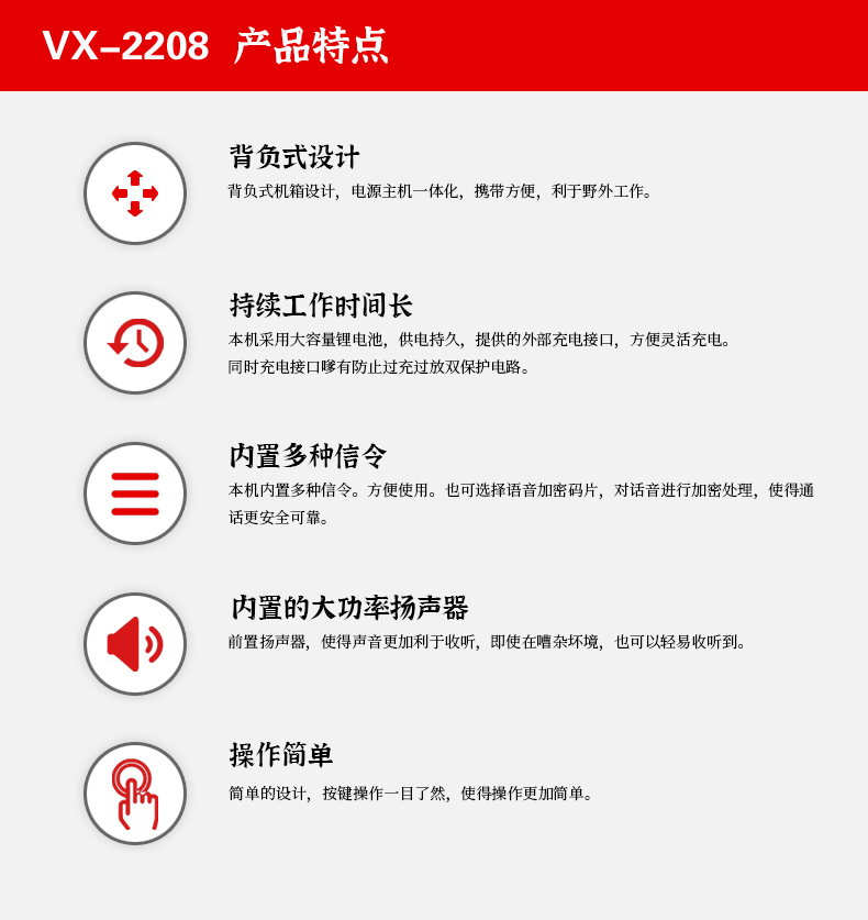 可選機型頻段,功率可調配置方便,內置鋰電池組供電。配專用充電器,背包和天線可方便背負或固定使用。